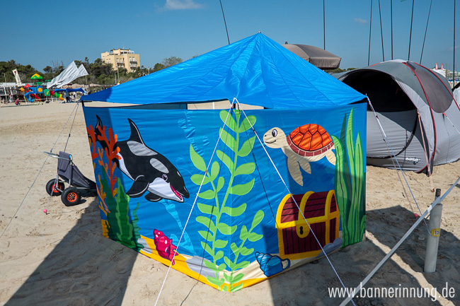 Passend zu unseren MehrMeer-Bannern wollten wir einen Wind- und Sonnenschutz haben. Der Vorteil: auf das Querformat passen die ganzen Motive noch viel besser nebeneinander.